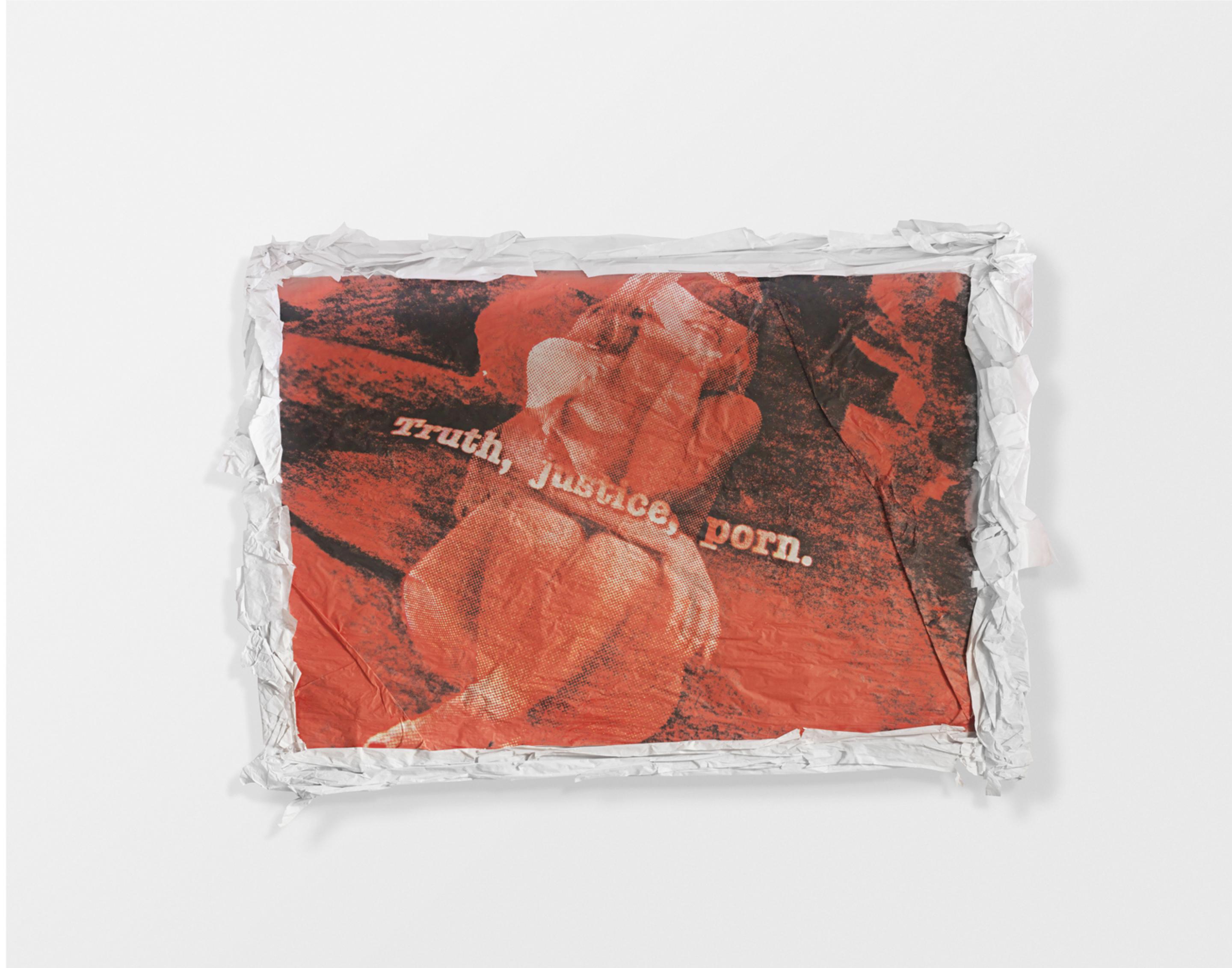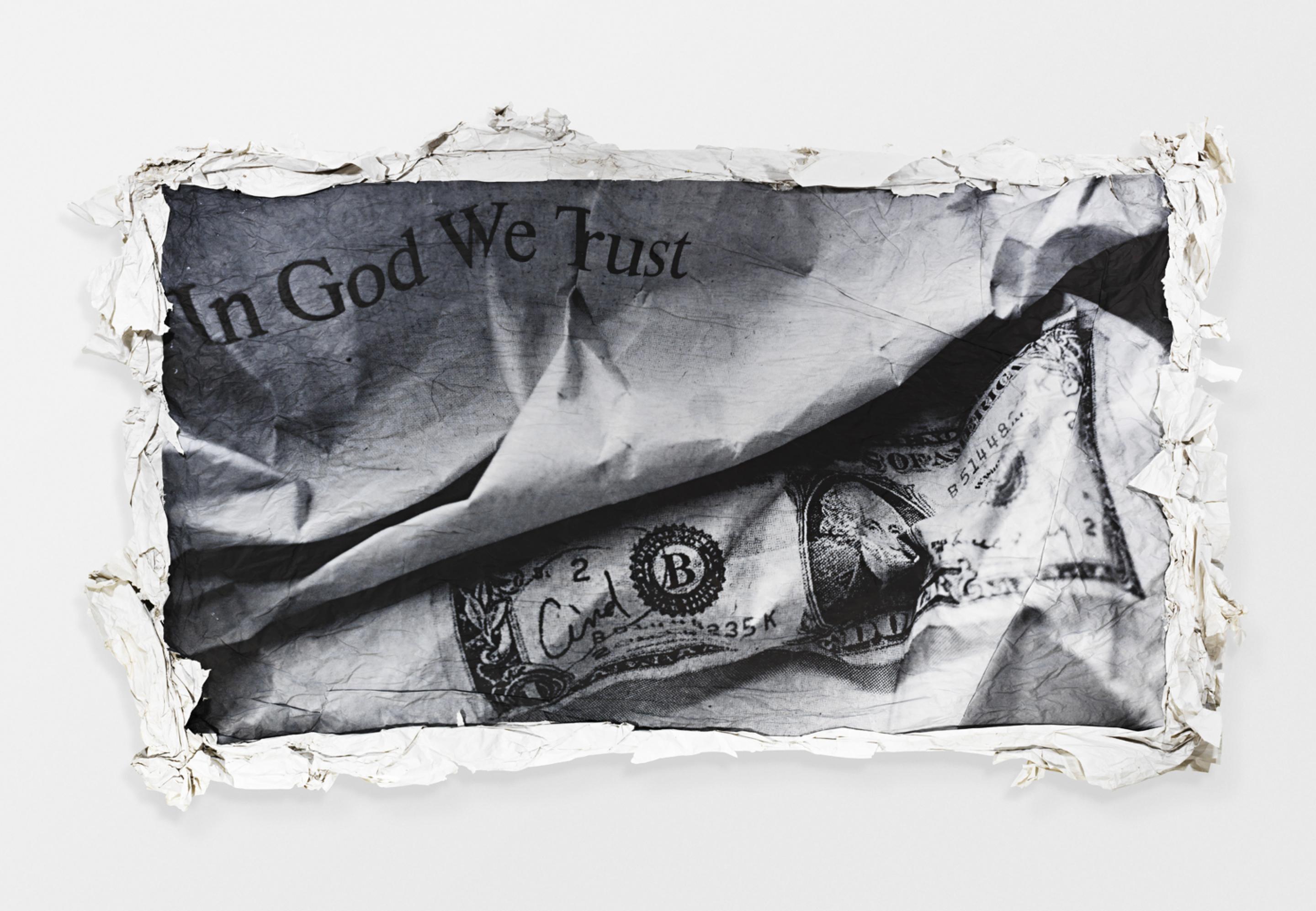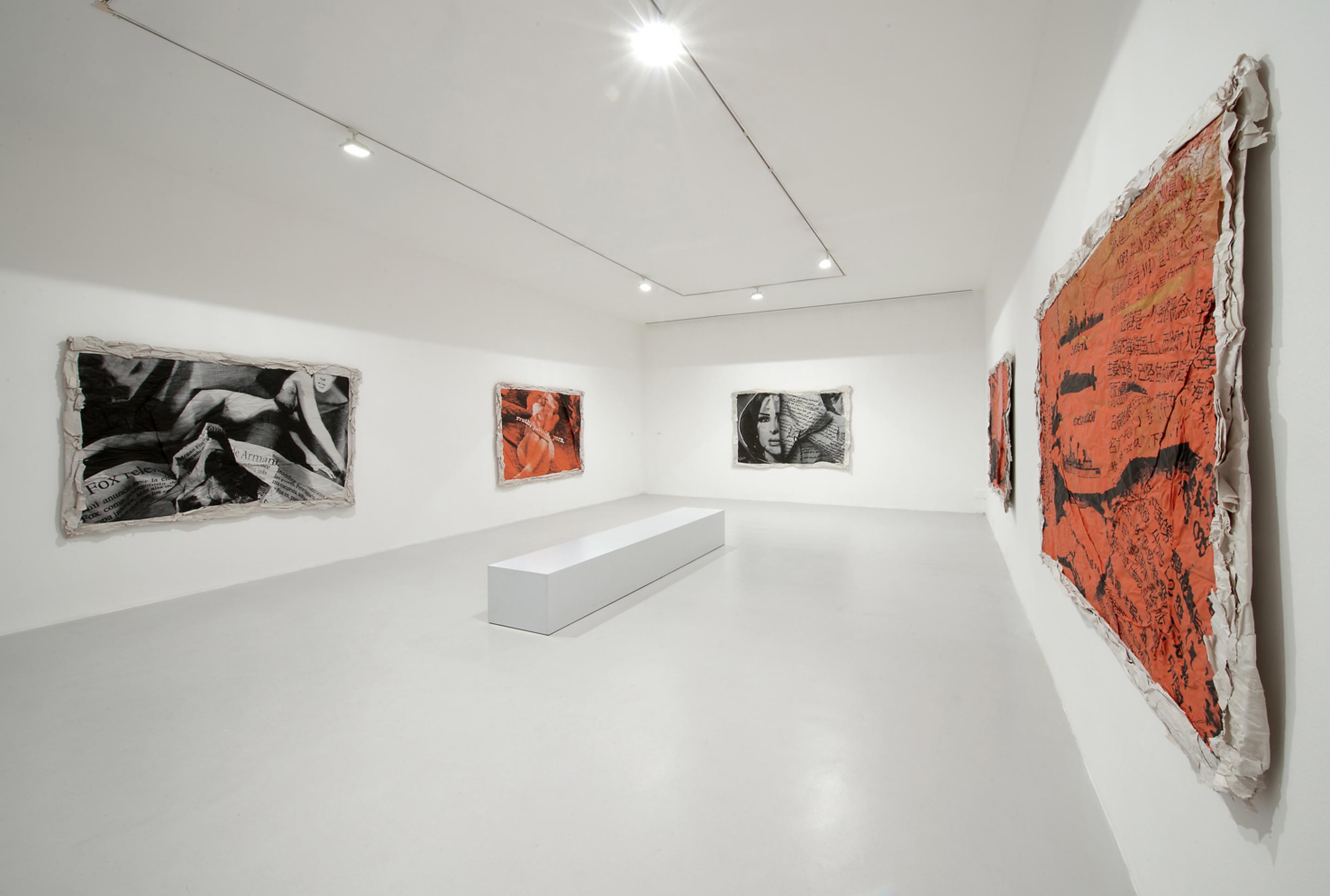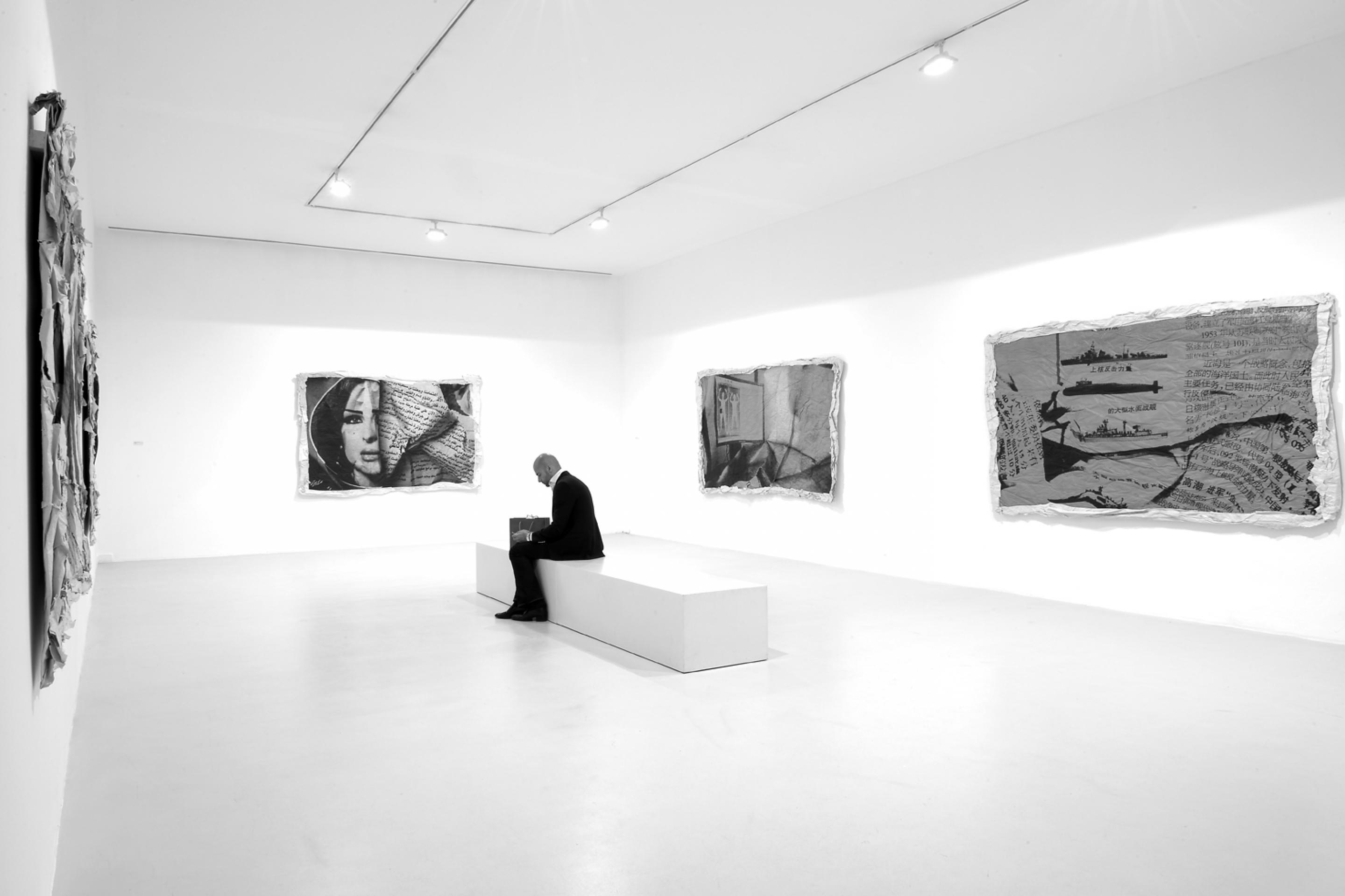 The artist works in a “world made of paper” using an elaborate technique: he browses through newspapers, choosing revealing images. He crumples these pages, and then photographs the wrinkled sheets of paper, which are then to be printed on magazine paper, and glued onto a layer made of newspapers.
