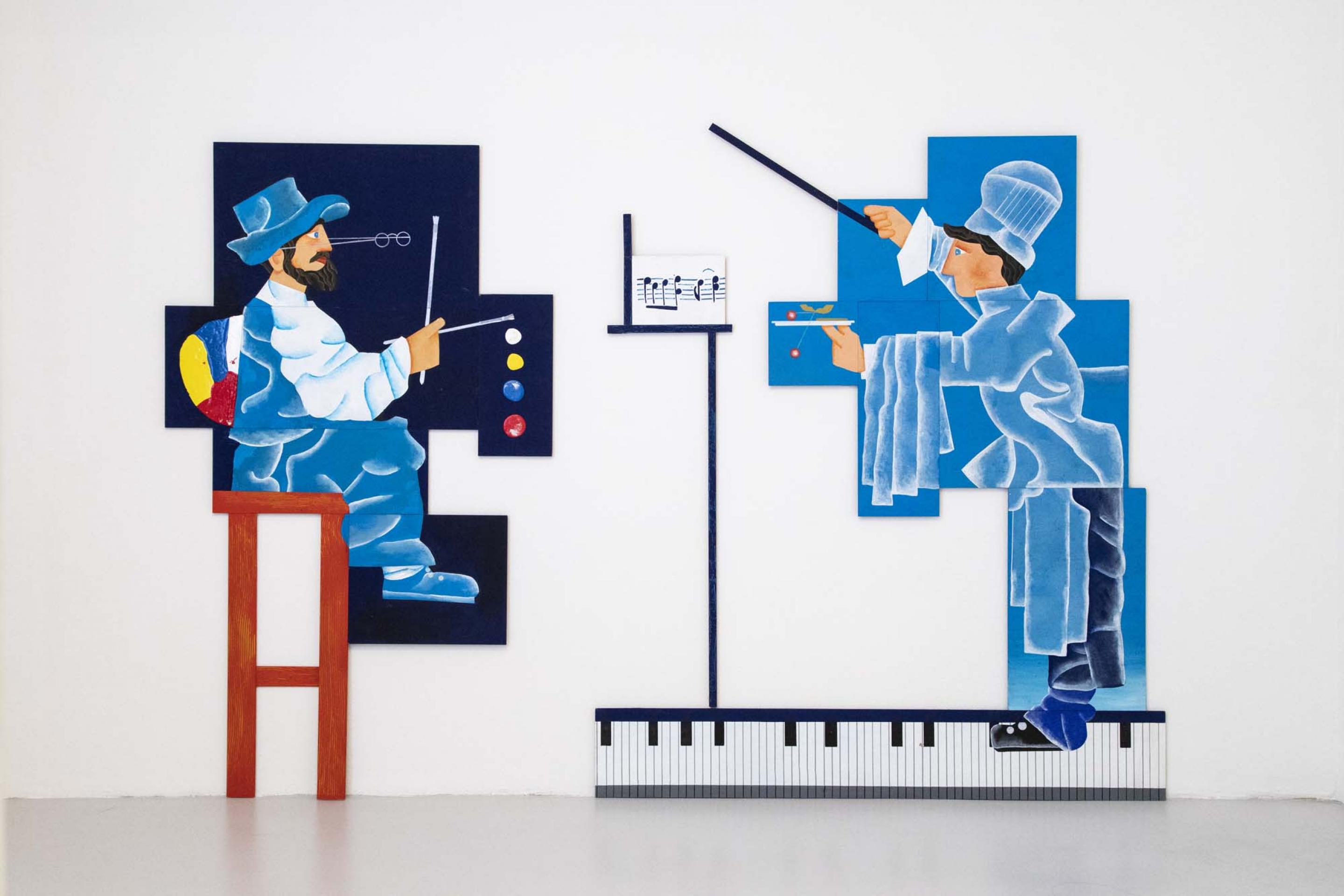 In the Seventies Aldo Spoldi combined conceptual art with theatrical projects, part of a generation of artists who tried to overcome conceptual rigour and rigidity by returning to an expressivity that offered a new narrative, drawing their tools indiscriminately from art history, everyday images and contemporary culture.