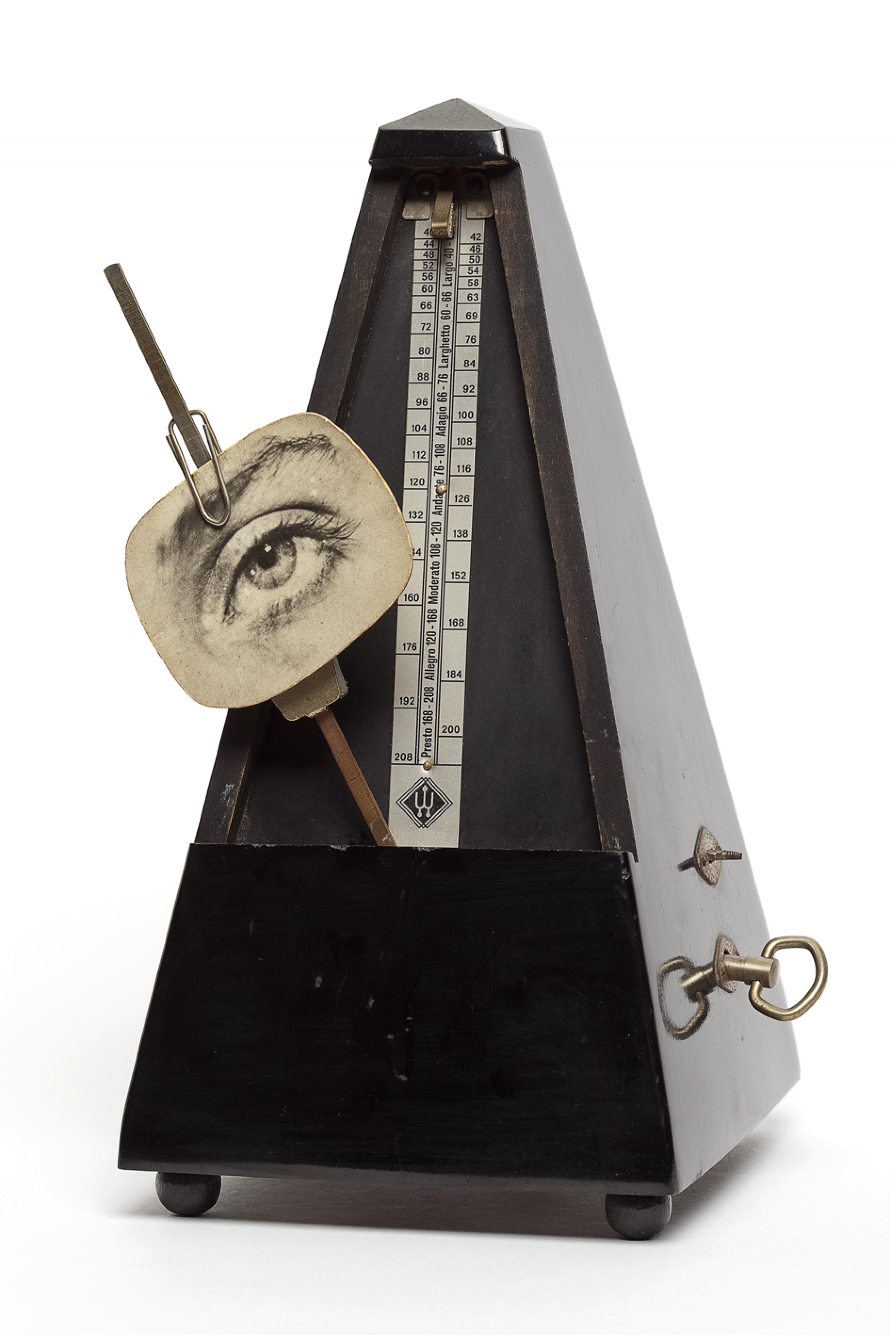 In spite of the commercial success of his photographs, Ray has always had a conflicting relationship with the medium photography. In a letter to his sister Elsie he exasperated: “I hate photography, and want to do only what is absolutely necessary to keep going, and produce something that interests me personally. (…) I have painted all these years (…) but these one-track minded Americans have now put me down as a photographer. (…) Do you wonder why I stay in Europe?” Beyond photography, Man Ray’s practice included assemblage, painting, and (kinetic) sculpture. Many of his works, such as Object to Be Destroyed (1923), a metronome with a photograph of an eye attached to its swinging arm, combined mechanical aesthetics with poetic absurdity, reflecting his interest in chance, automatism, and the unconscious mind.