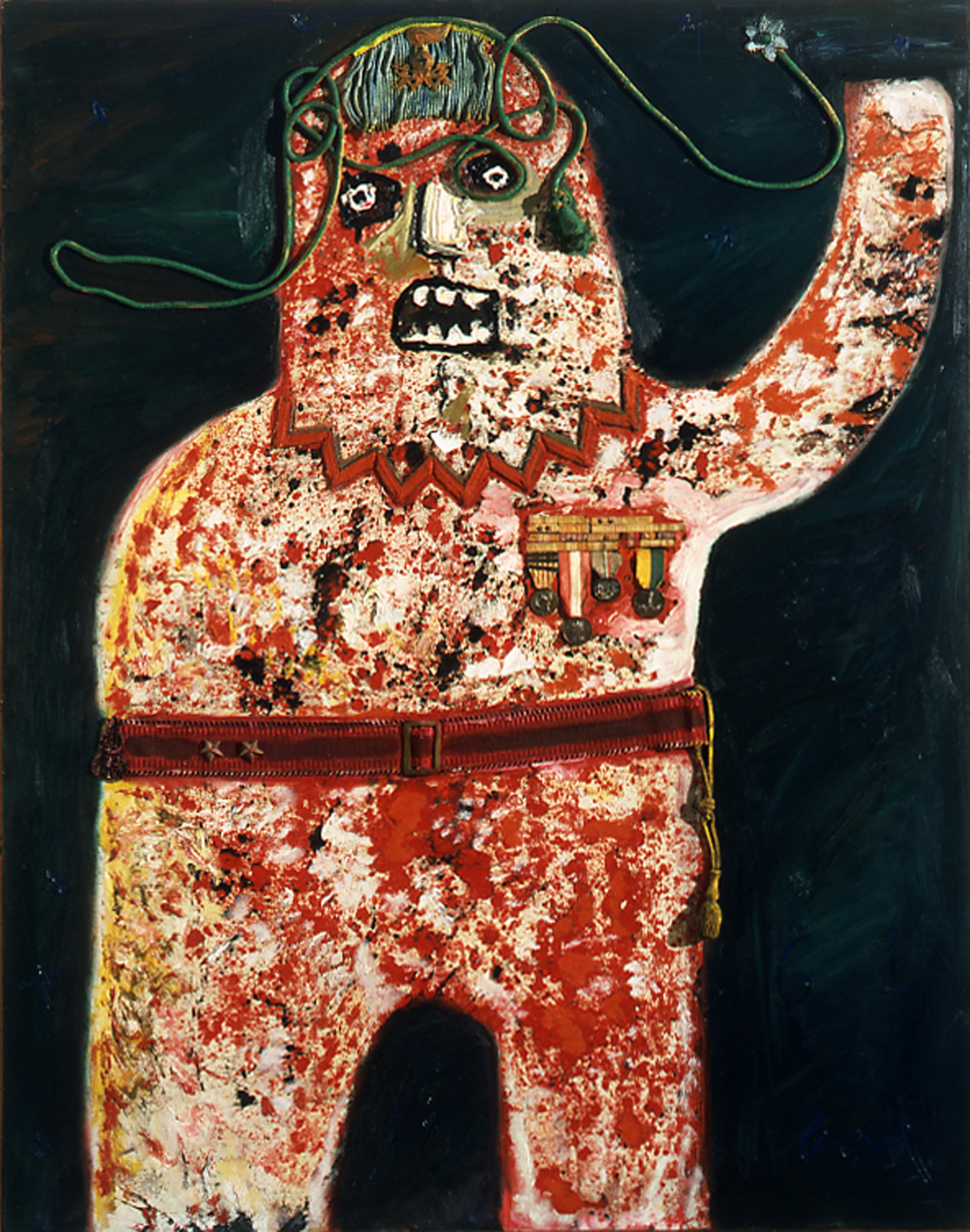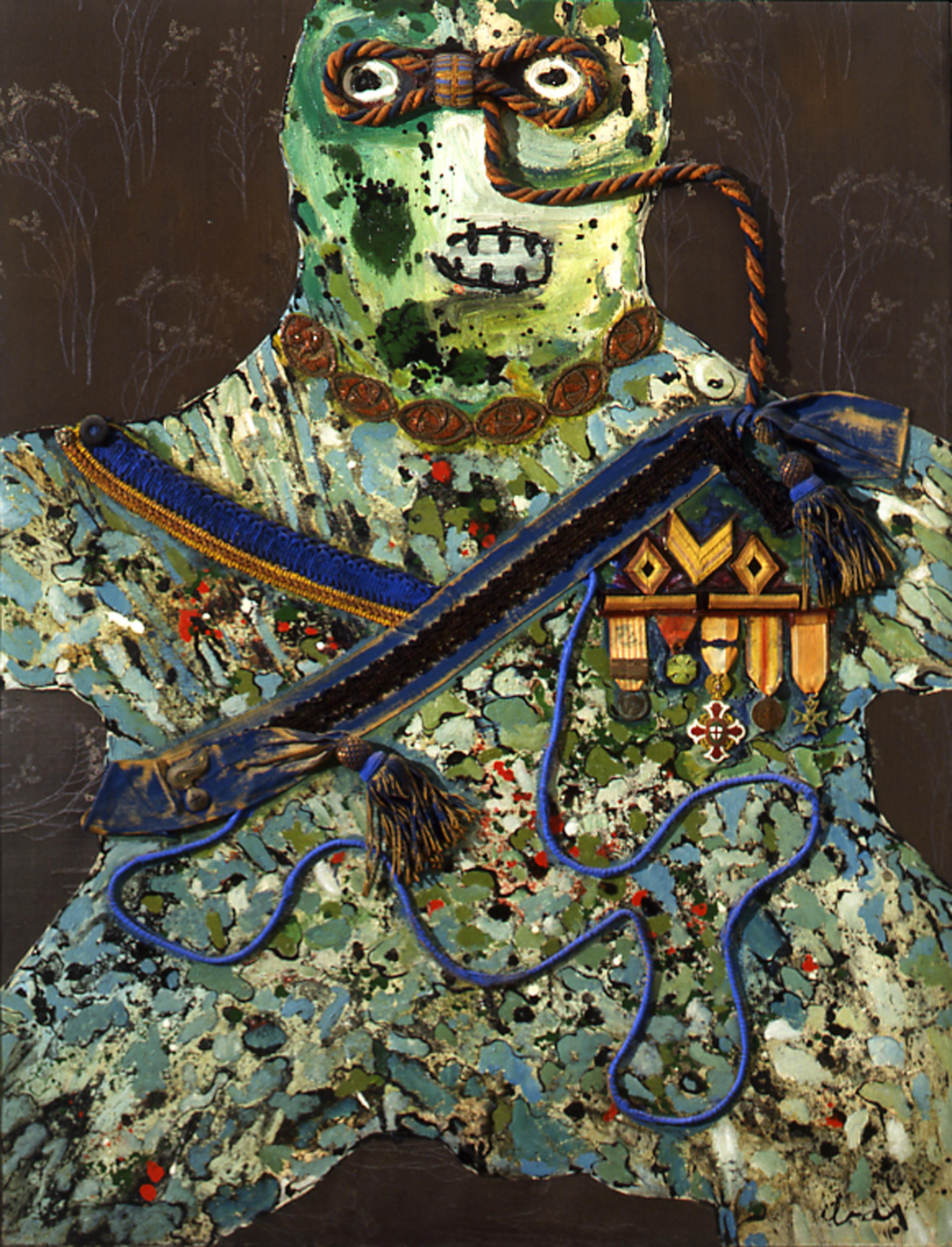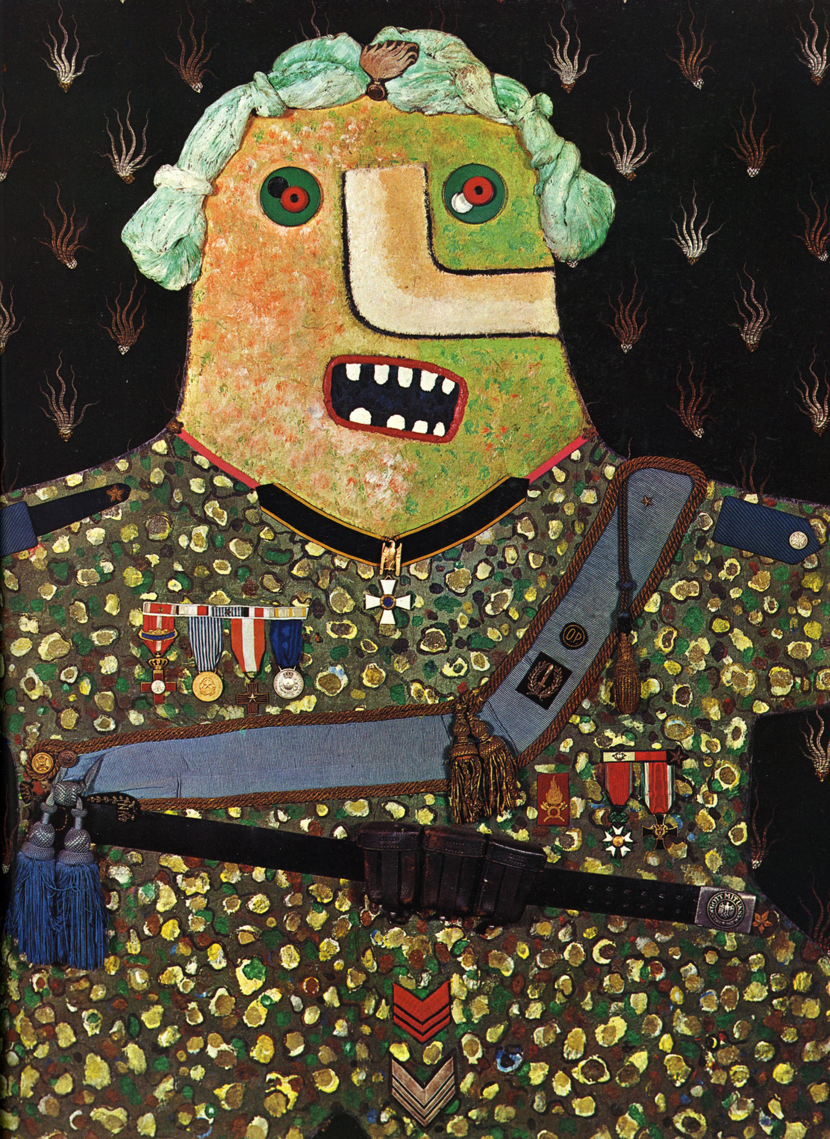 From the collection of the Musée national d’art moderne, Centre Pompidou in Paris, comes the General, 1969, a canvas of 150x114 cm, acrylic and collage with decorations, insignia, tassels and belt, whose "big face" Baj had chosen for the cover of his first Catalogo generale Bolaffi nel 1973.