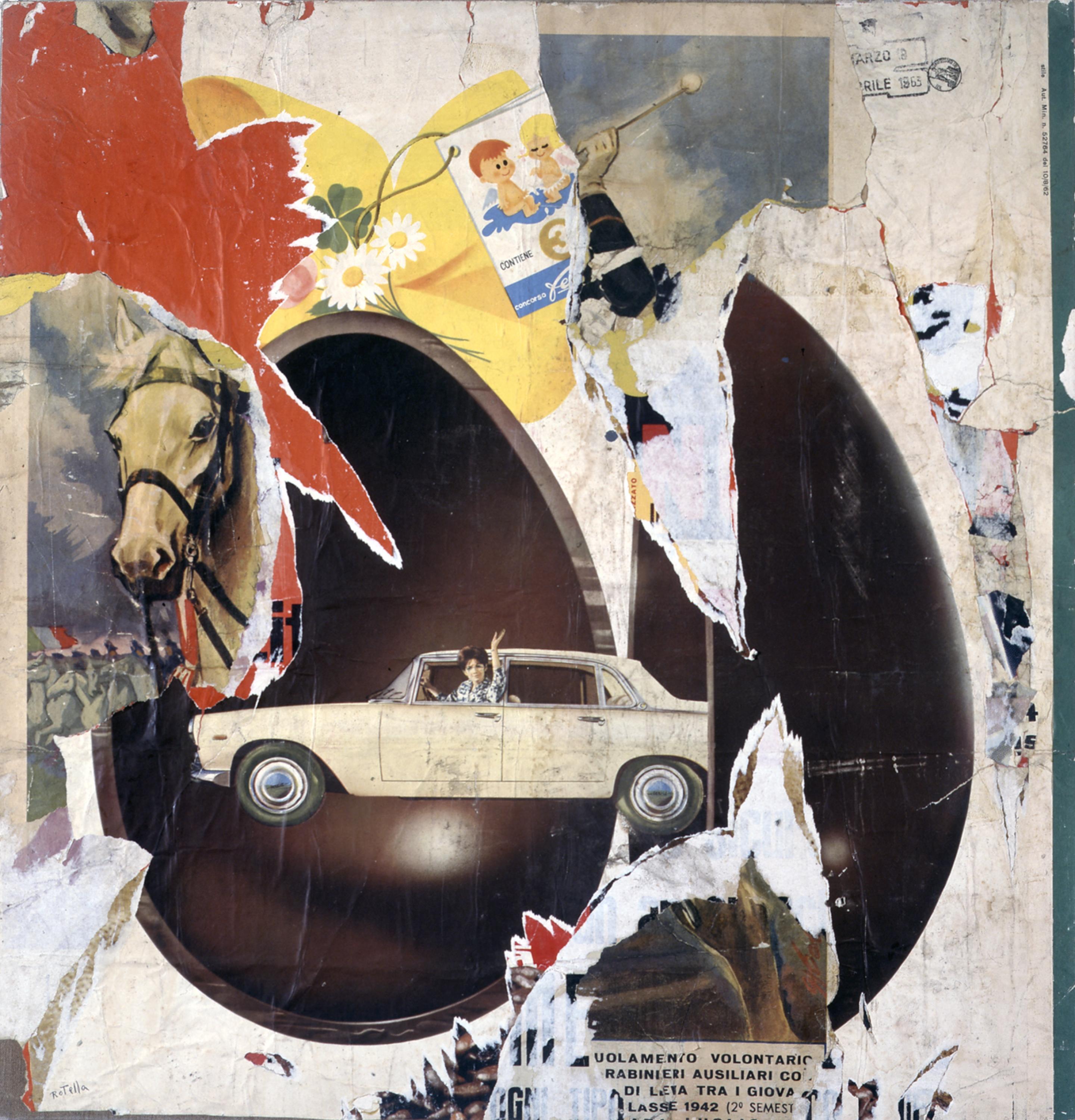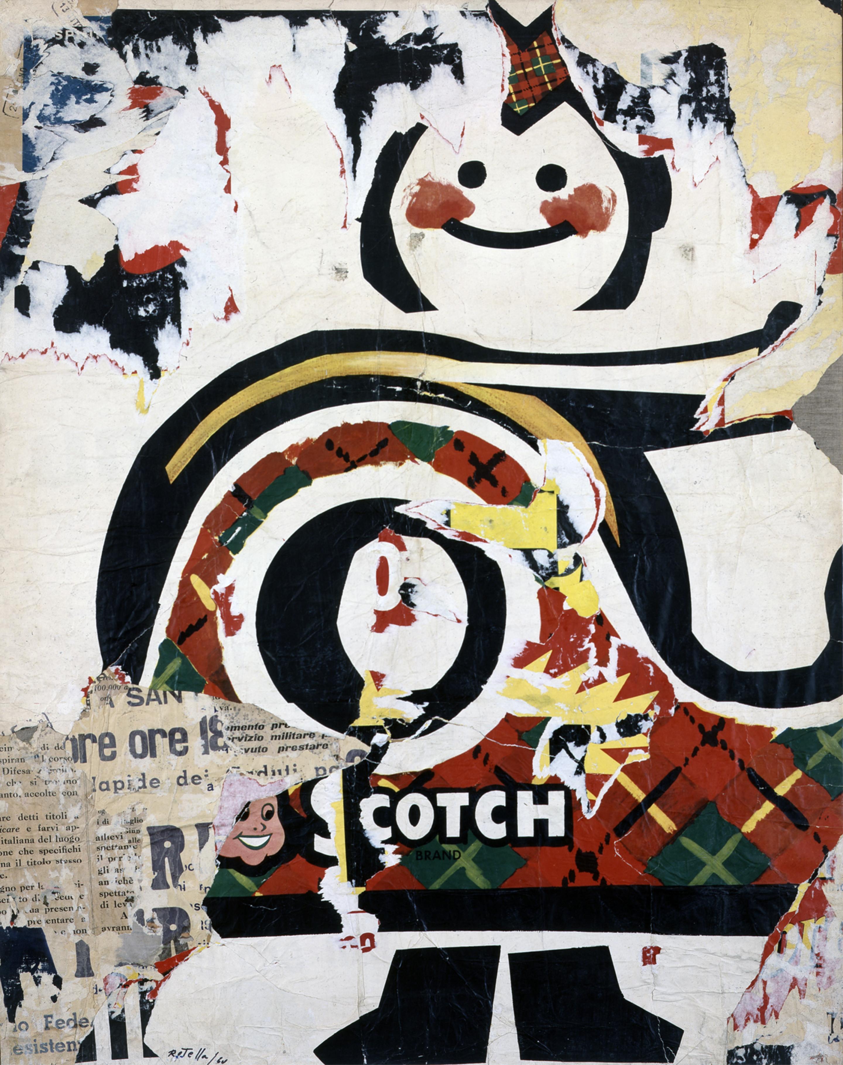 At the second floor of the Marconi Foundation a selection of works from 1949 to 1970 will be on display, among which the collage Eclisse gialla (1949), the retro d’affiches Come un arazzo (1956) and Argentina (1957); the décollages Un poco in su (1954), Espansione piacevole, (1958), Le cachet, (1960), Scotch Brand (1960) and Viva America (1963); the artypos on plexiglass The brandy of Napoleon and Natura Morta (1972), and on emulsified canvas Les deux amies (1966).