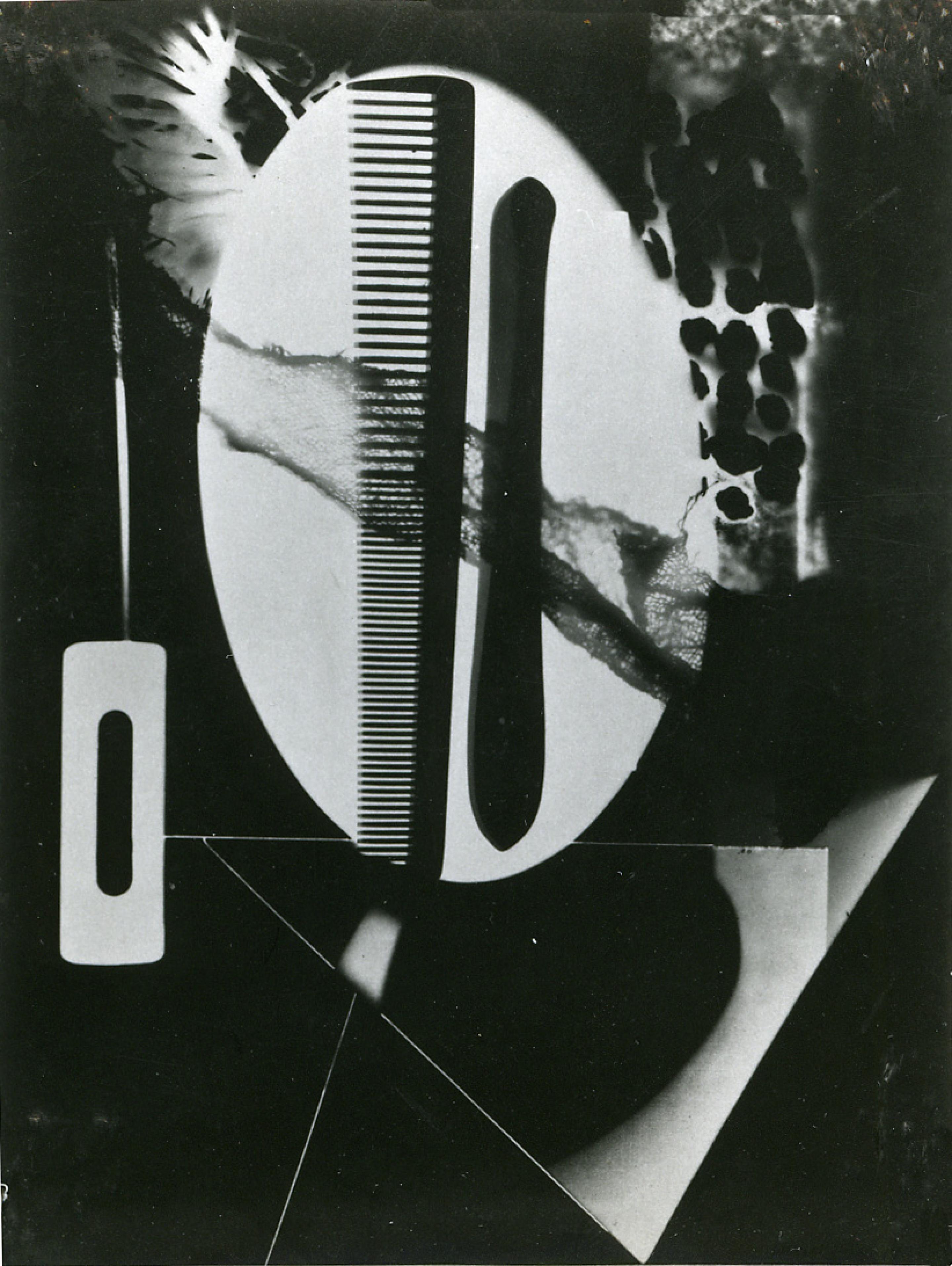 Called "rayographs," these photos were made by placing and manipulating objects (like a revolver, a key, a comb, a funnel...) on pieces of photosensitive paper.
