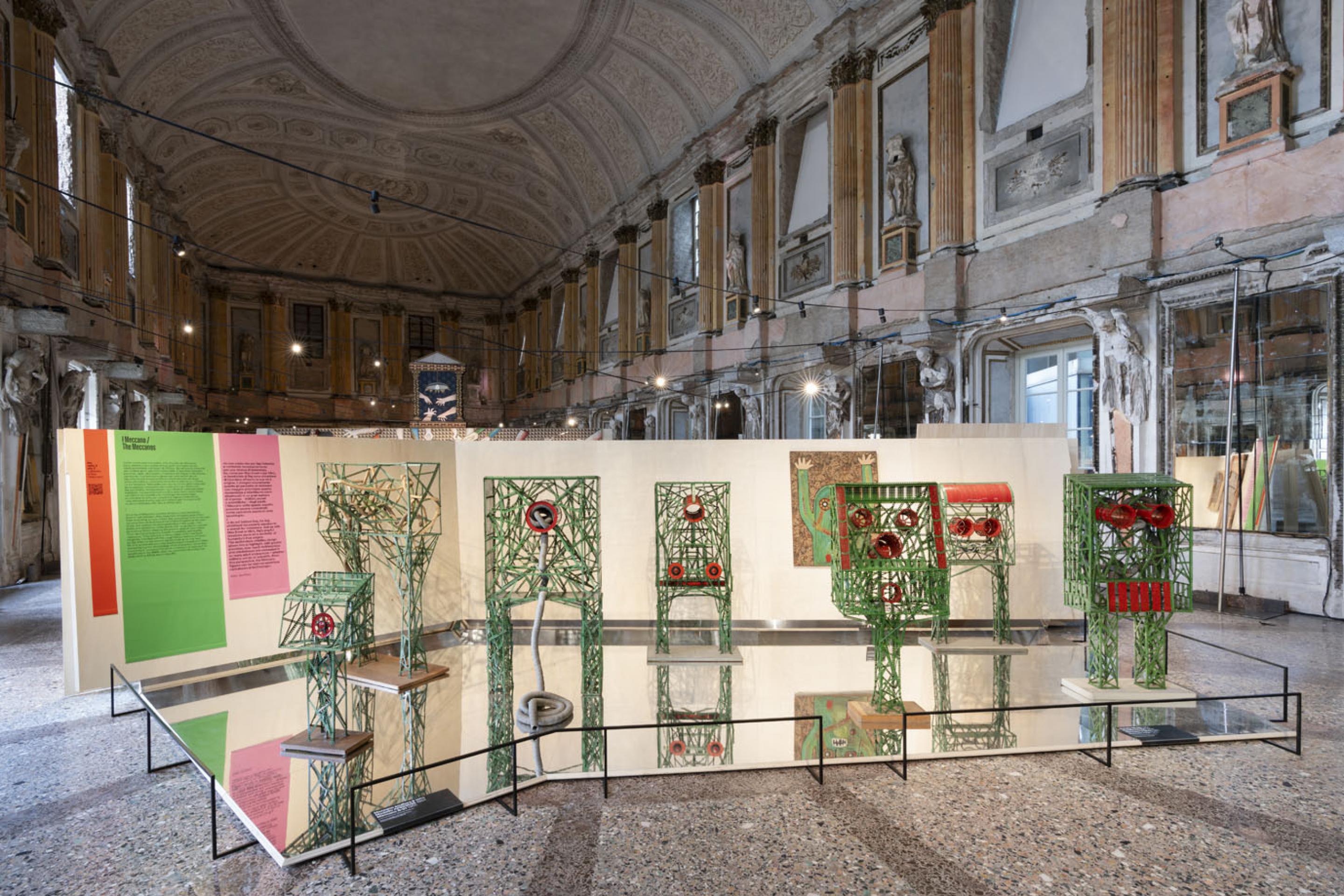 His famous aesthetics of trinkets and trimmings, tassels and shiny buttons like insignia on the pompous chests of his emblazoned soldiers will be the common thread that stitches together the gigantic themes of Baj’s poetics in sections, freed from a rigid sequence by chronology or genre, continuously cross-referencing art and literature, colours and words, following a sort of script that, even during the staging, will suggest a theatrical