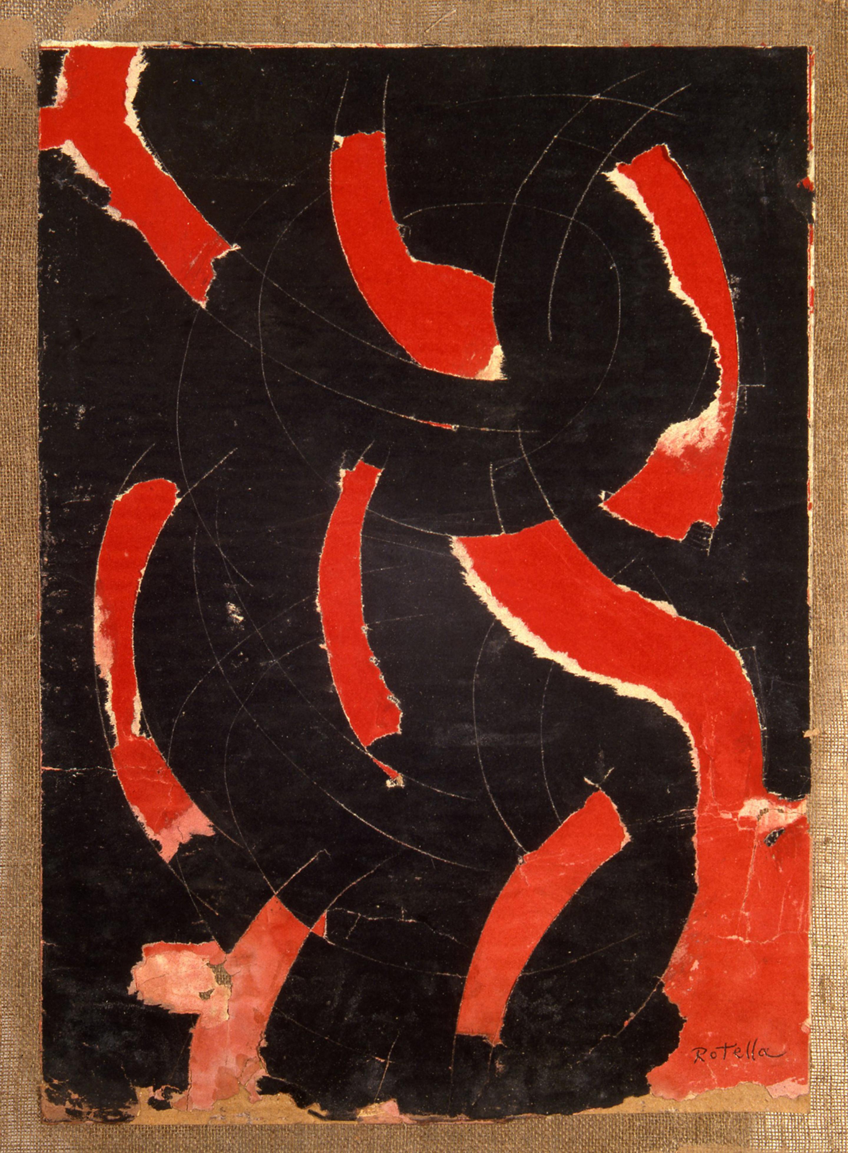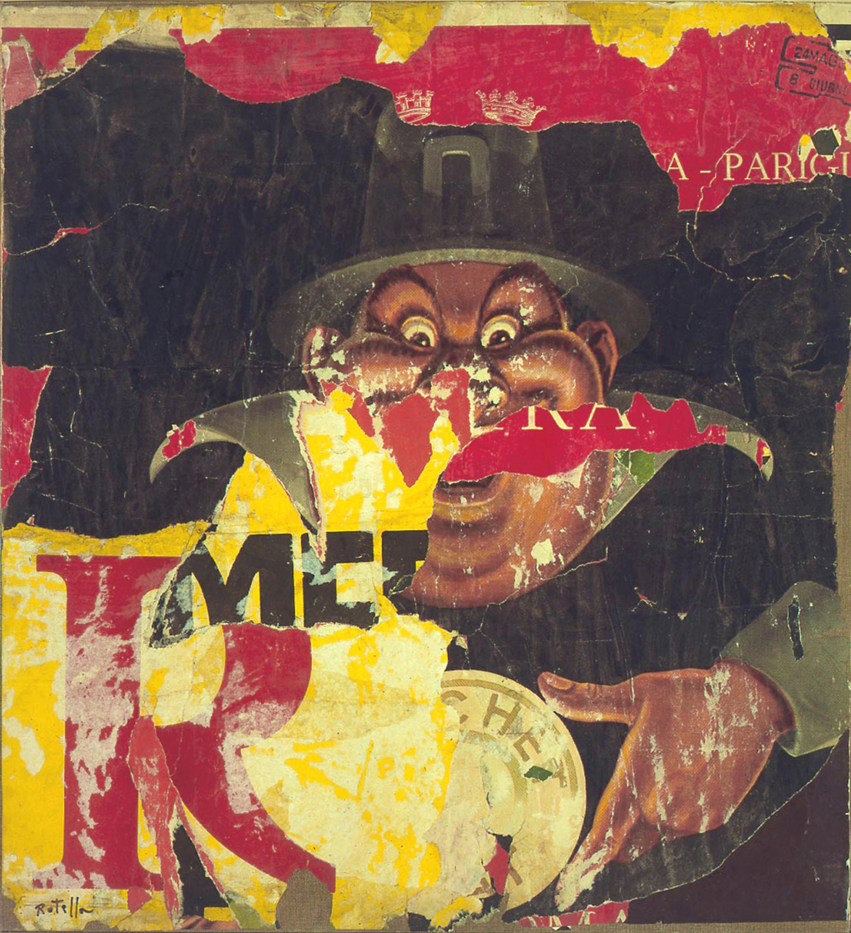 Nascono così i décollages, ovvero sovrapposizioni di carte lacerate, mai casuali, eseguite con l’intenzione di ottenere un equilibrio compositivo, con precisi rapporti cromatici e materici. Oltre a una chiara ammissione di dissenso nei confronti della pittura tradizionale, il gesto di strappare i manifesti è per Rotella il modo di appropriarsi di un aspetto del reale, infatti nel 1960 verrà inserito da Pierre Restany nel gruppo del Nouveau Réalisme.