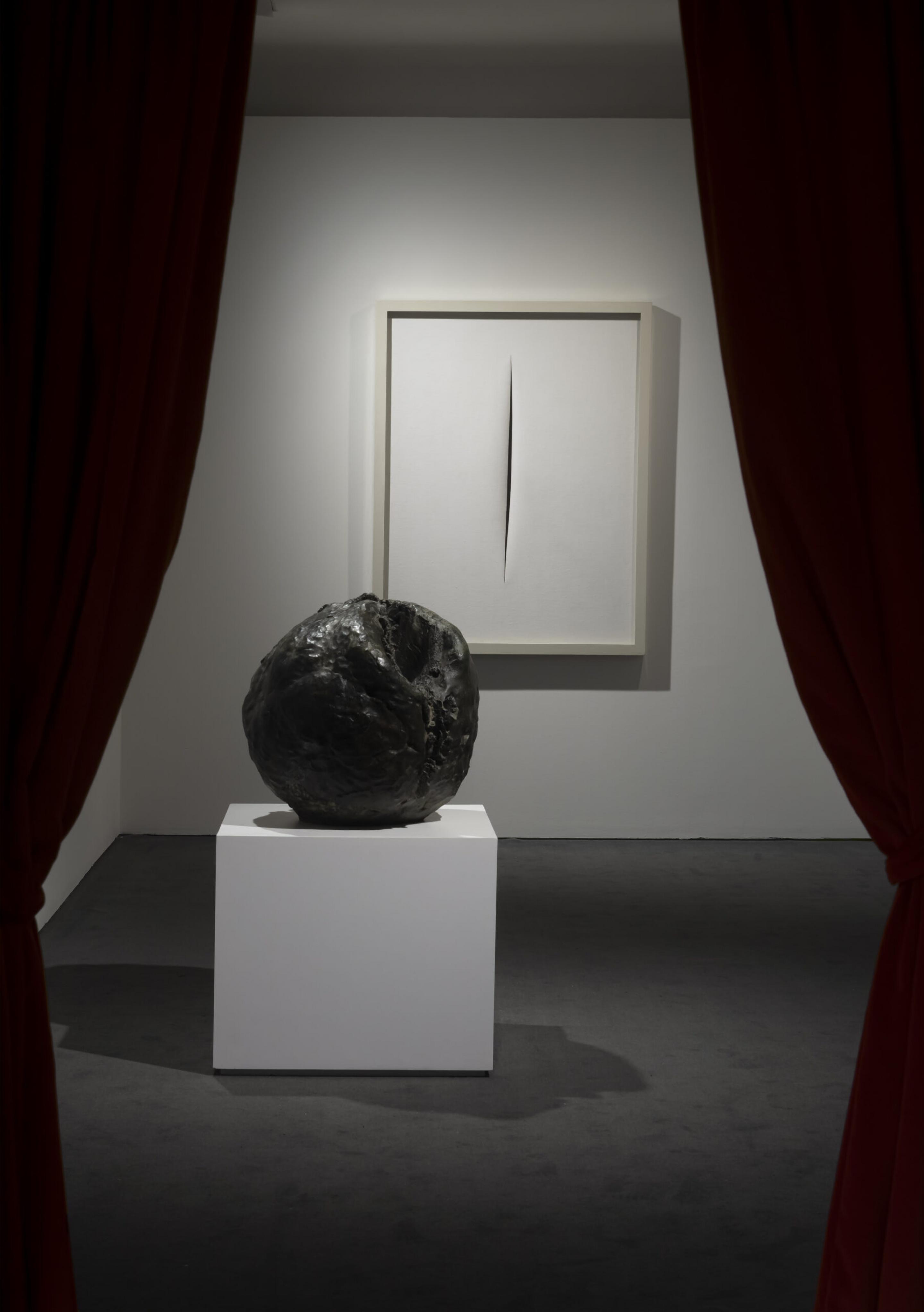 La mostra riunirà una serie di disegni e piccole sculture che permetteranno di interrogarsi sulla genesi degli Ambienti Spaziali, dei Concetti Spaziali e delle Nature, e sulle prefigurazioni in essi implicite. Com’è noto, la ricerca di Lucio Fontana si svolge all’insegna di una nuova esperienza e concezione non solo dello spazio, ma anche del tempo, colto in una doppia dimensione: verso il passato dei primordi, quello della nascita della Terra, e verso il futuro dell’Universo, quello della sua dimensione incalcolabile. La sua ricerca approfondisce la dimensione ctonia, originaria, tellurica di una materia appena generata, non in senso religioso ma cosmologico. Una dimensione che riporta il nostro immaginario agli inizi del creato, della Terra e della Luna, alla cui conquista Fontana fu sensibile, come se quegli ammassi di materia compatta e carica di energia, come meteore, o come se quell’insieme di perforazioni, in forma di spirali e vortici, fossero galassie in formazione. Una esplorazione che abbraccia e riunisce il micro e il macrocosmo, il livello più organico, primario, notturno della sessualità e quello diuturno dell’immaginazione concettuale.